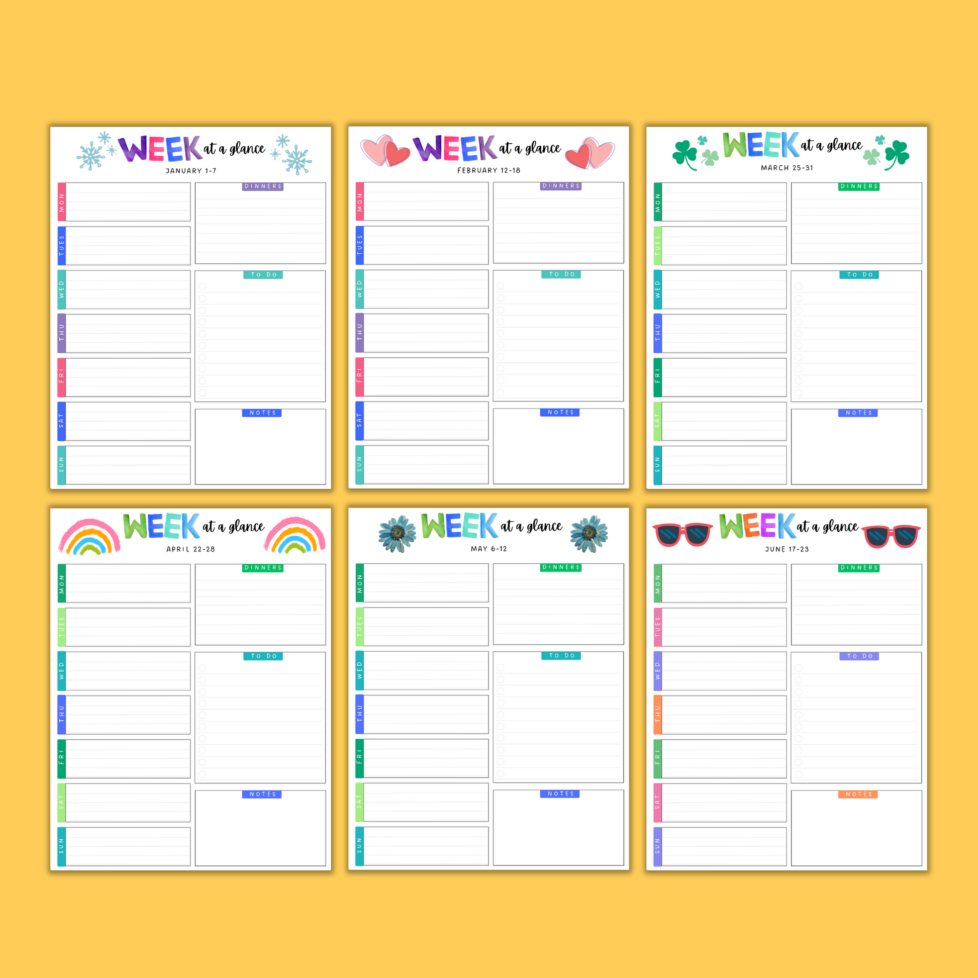 And then there's the 52-week-at-a-glance calendars. These bad boys are perfect for jotting down quick reminders or highlighting the biggest to-dos and appointments coming up that week. Hang these on the fridge or your workspace so you can check in and stay on track. Consider it your trusty sidekick in the constant juggling act that is moms life!