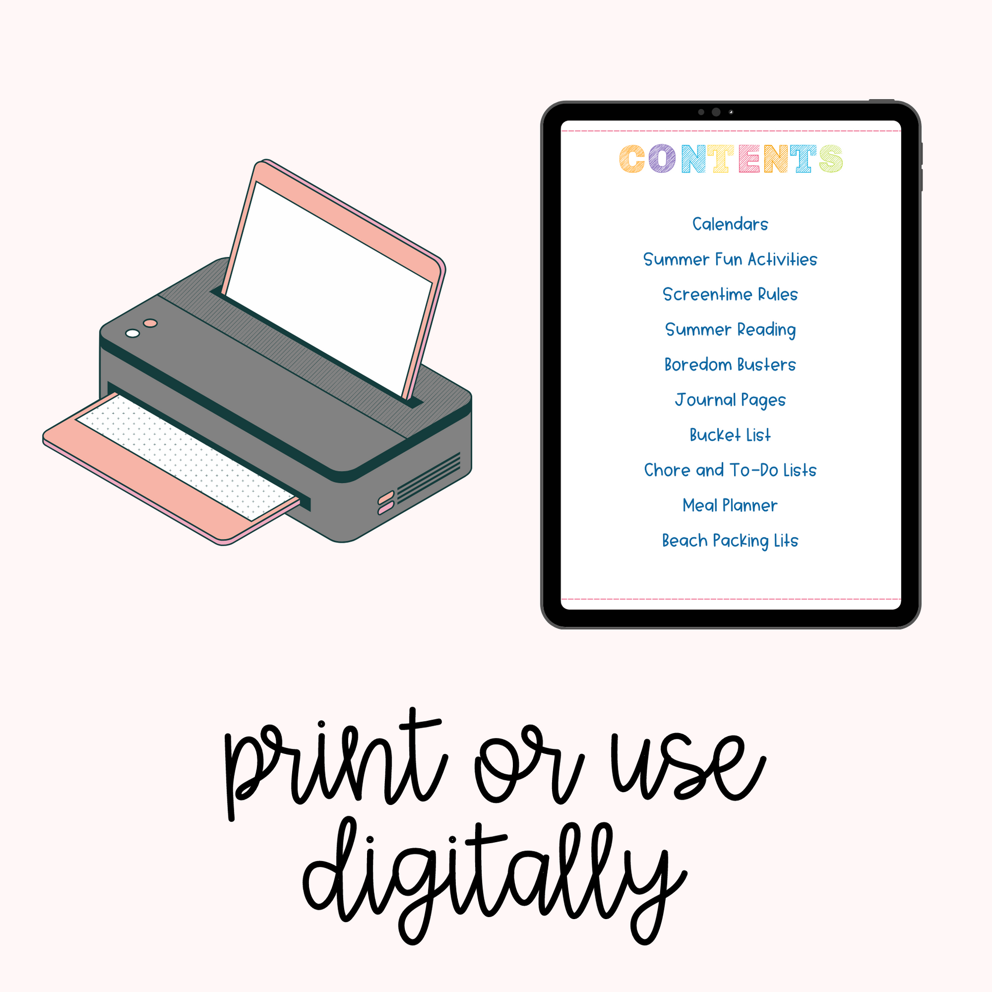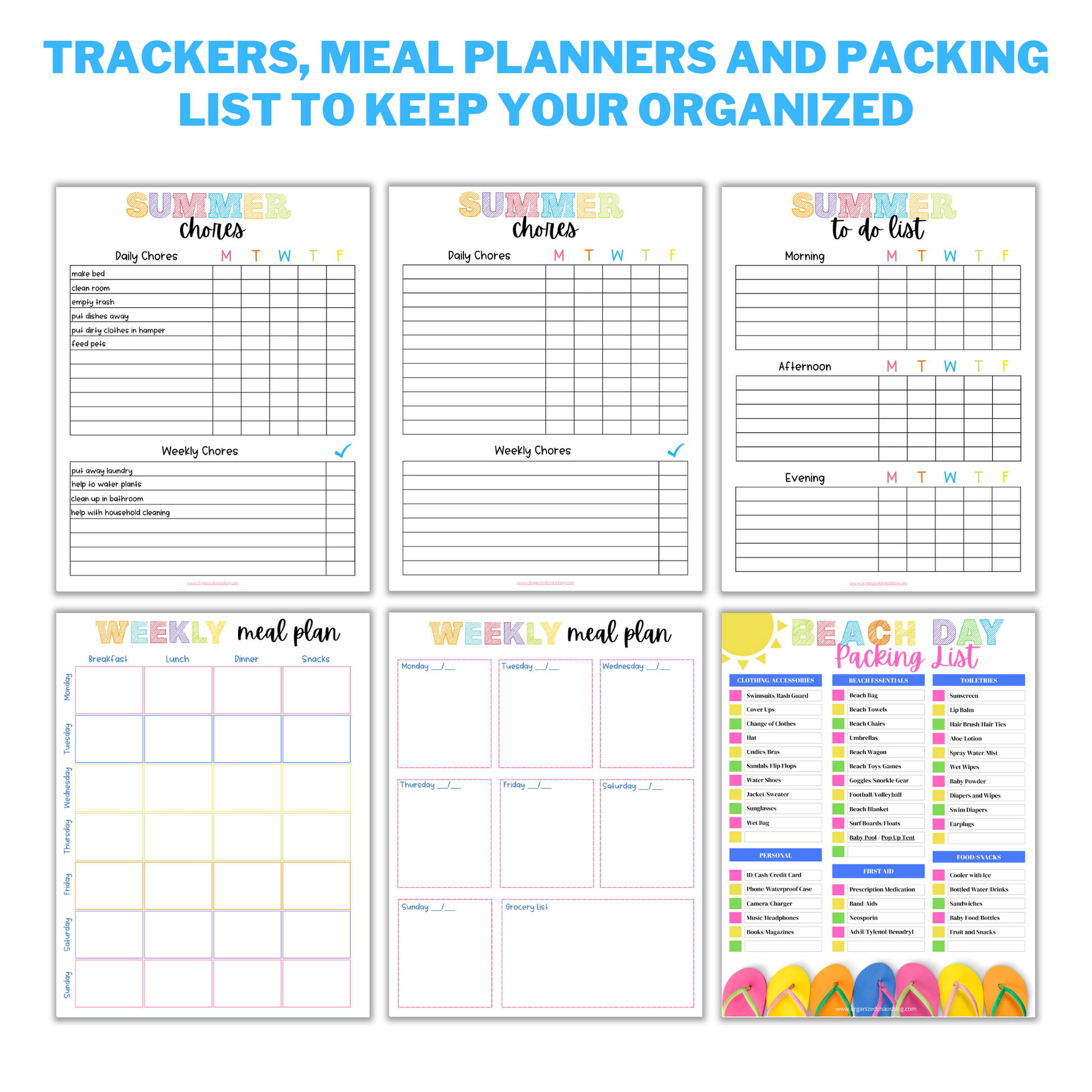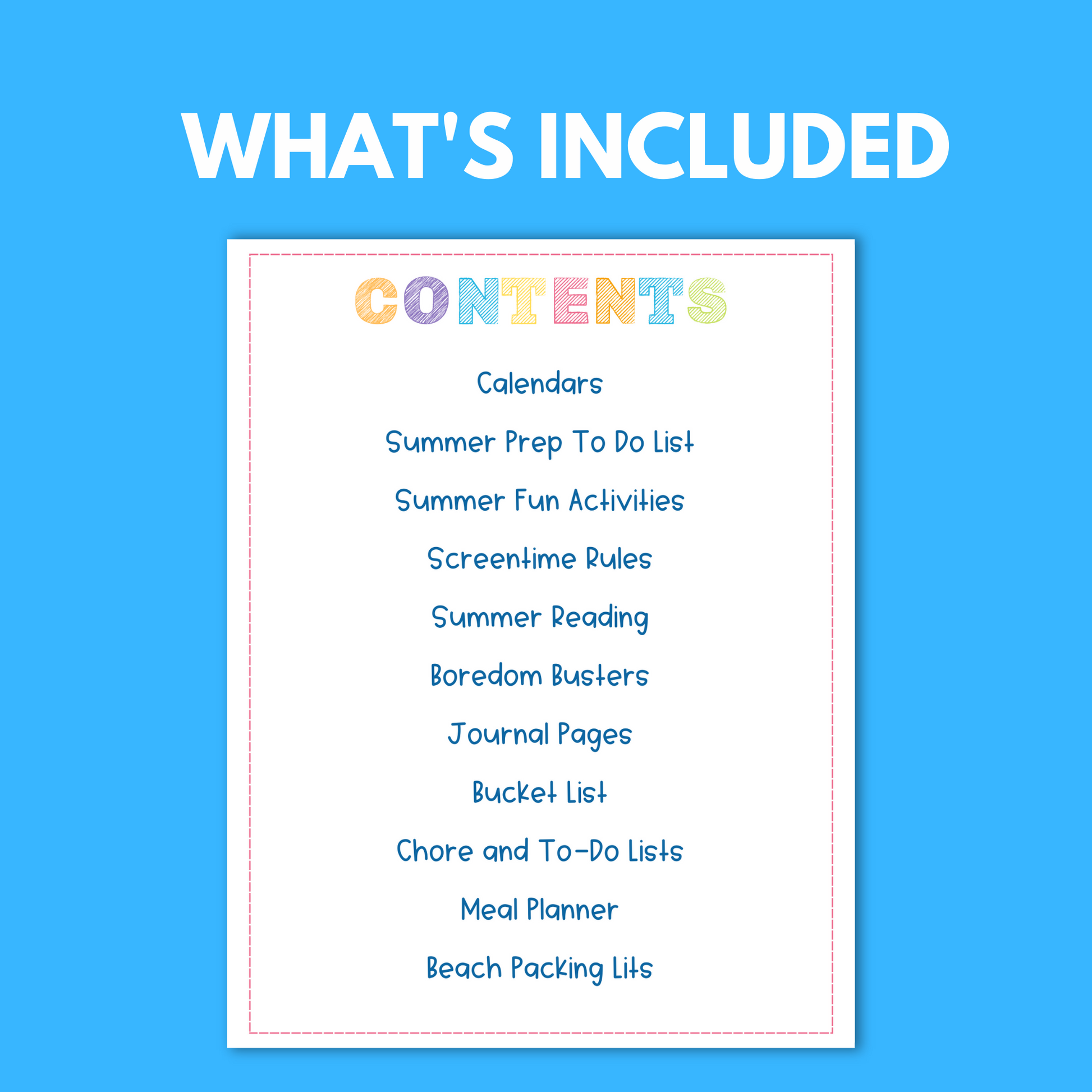 Looking for some fun activity ideas? This planner has plenty of those too! There are boredom busters to keep your kids active, screentime rules to help manage their time spent in front of electronic devices, daily journal pages for kids to express themselves creatively and create lasting memories, a bucket list to remind you of all the wonderful things you want to do (and check off!) while the summer is still here plus a convenient chore list and a meal planner so dinner preparations go smoothly each night. And let's not forget the ultimate summer essential -- a packing list for those much-needed days at the beach!